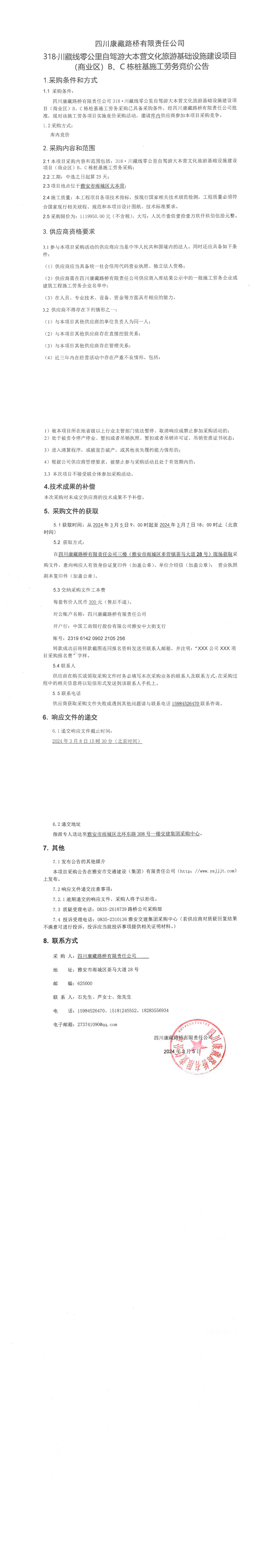 四川康藏路橋有限責(zé)任公司318·川藏公路零公里自駕游大本營(yíng)文化旅游基礎(chǔ)設(shè)施建設(shè)項(xiàng)目(商業(yè)區(qū))B\C棟樁基施工勞務(wù)競(jìng)價(jià)公告