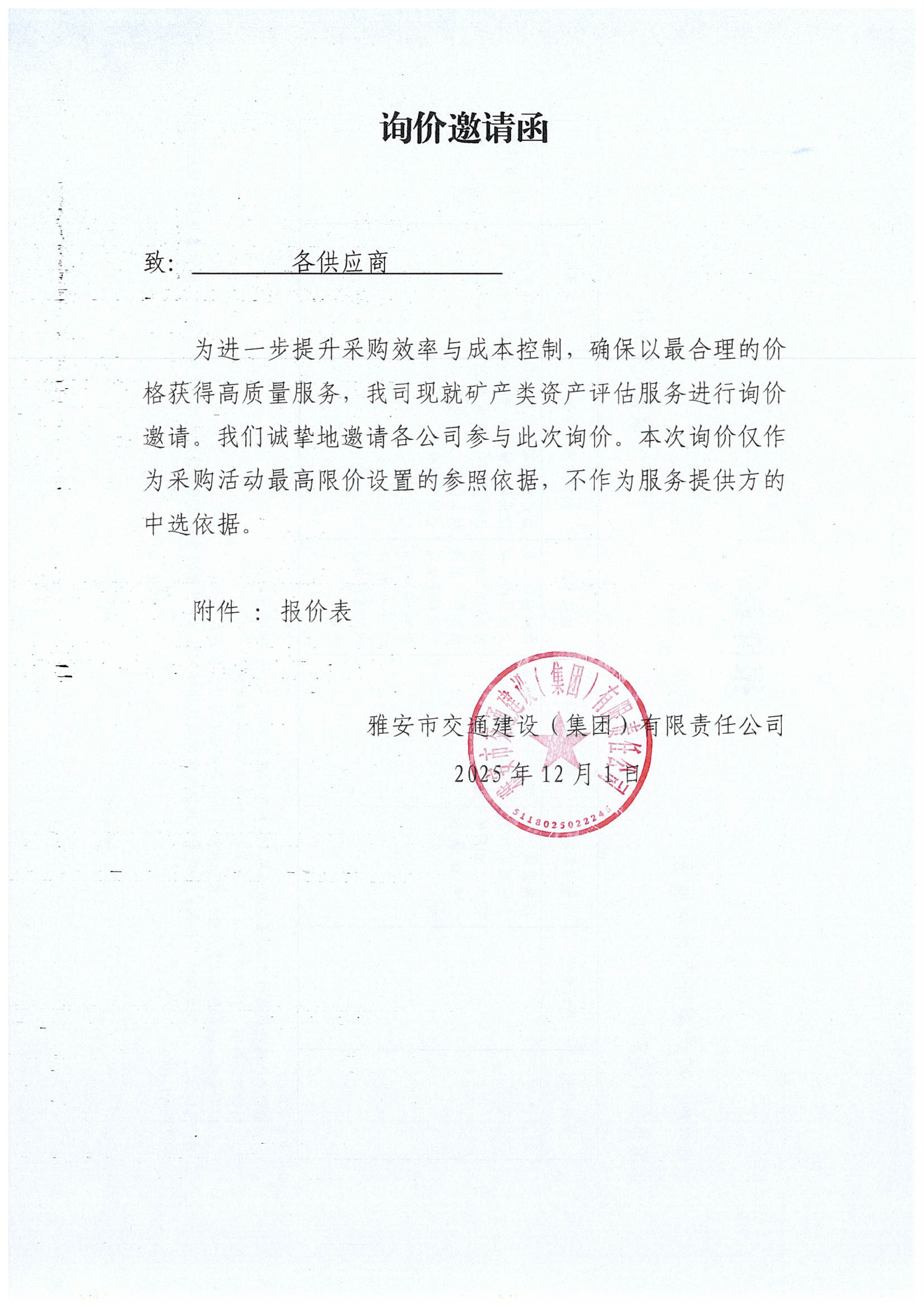 關(guān)于雅安市交通建設(shè)(集團(tuán))有限責(zé)任公司礦產(chǎn)類資產(chǎn)評(píng)估服務(wù)采購限價(jià)的詢價(jià)函