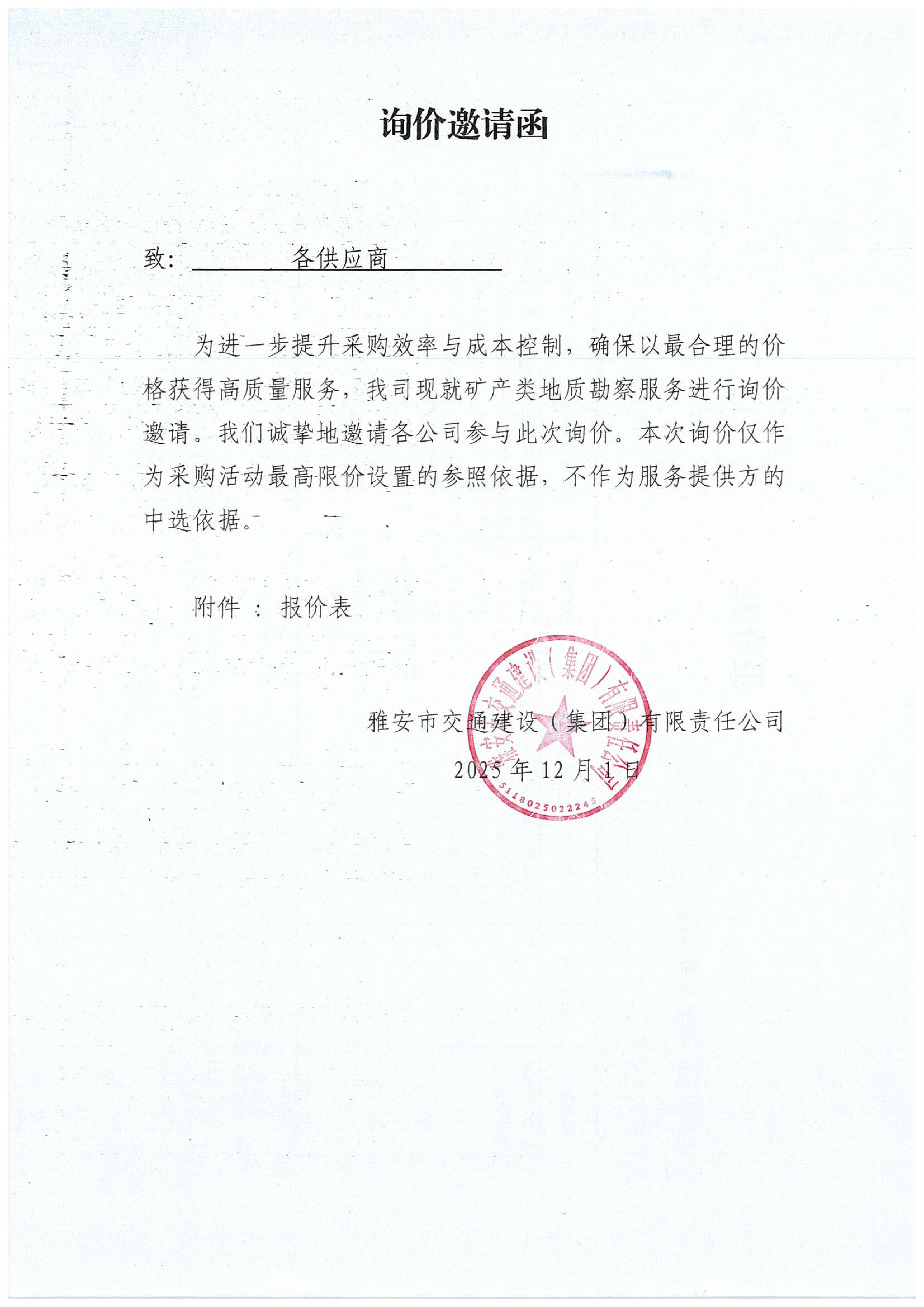 關(guān)于雅安市交通建設(shè)(集團)有限責(zé)任公司礦產(chǎn)類地質(zhì)勘察服務(wù)限價的詢價函
