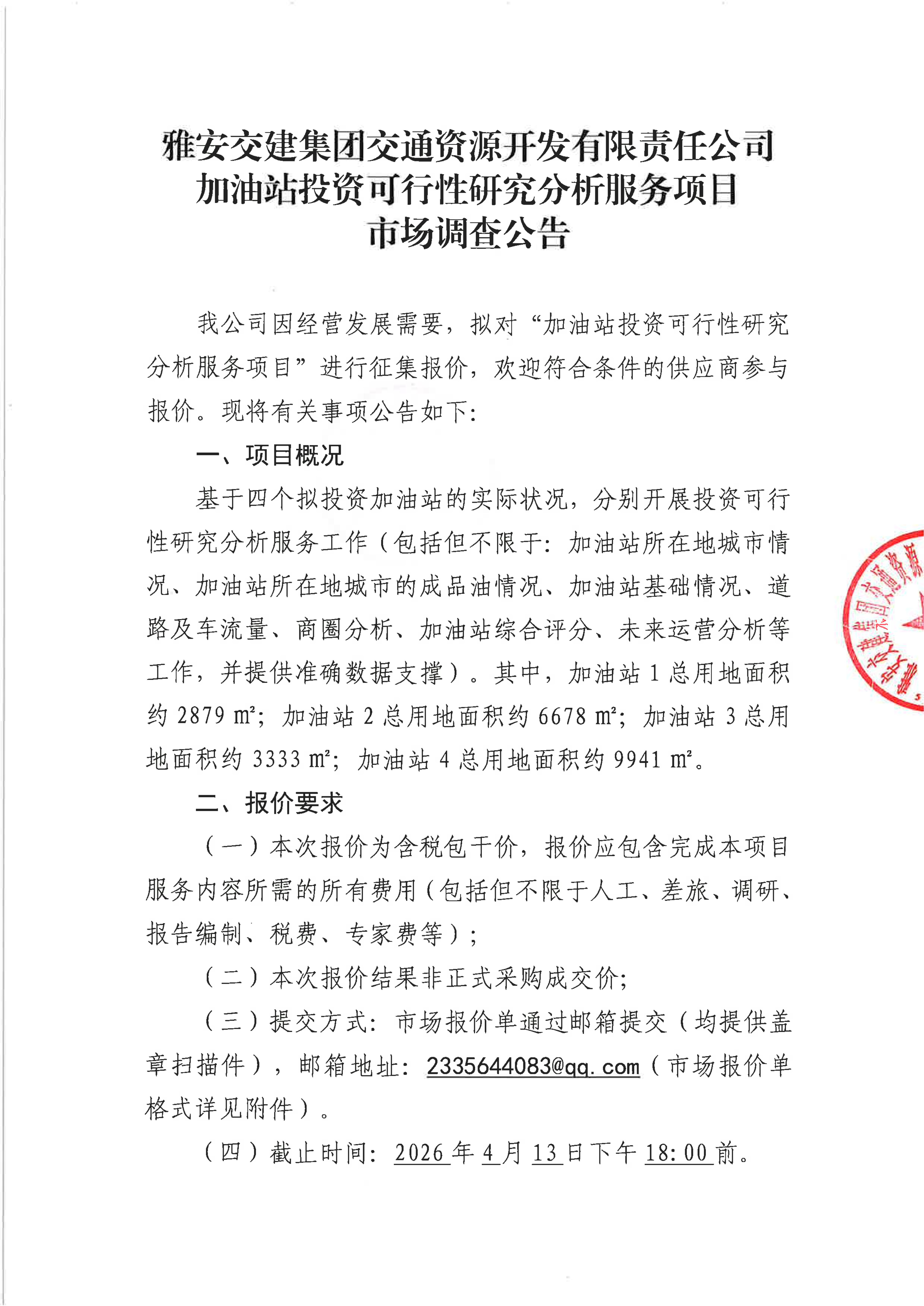 雅安交建集團(tuán)交通資源開發(fā)有限責(zé)任公司加油站投資可行性研究分析服務(wù)項(xiàng)目市場(chǎng)調(diào)查公告