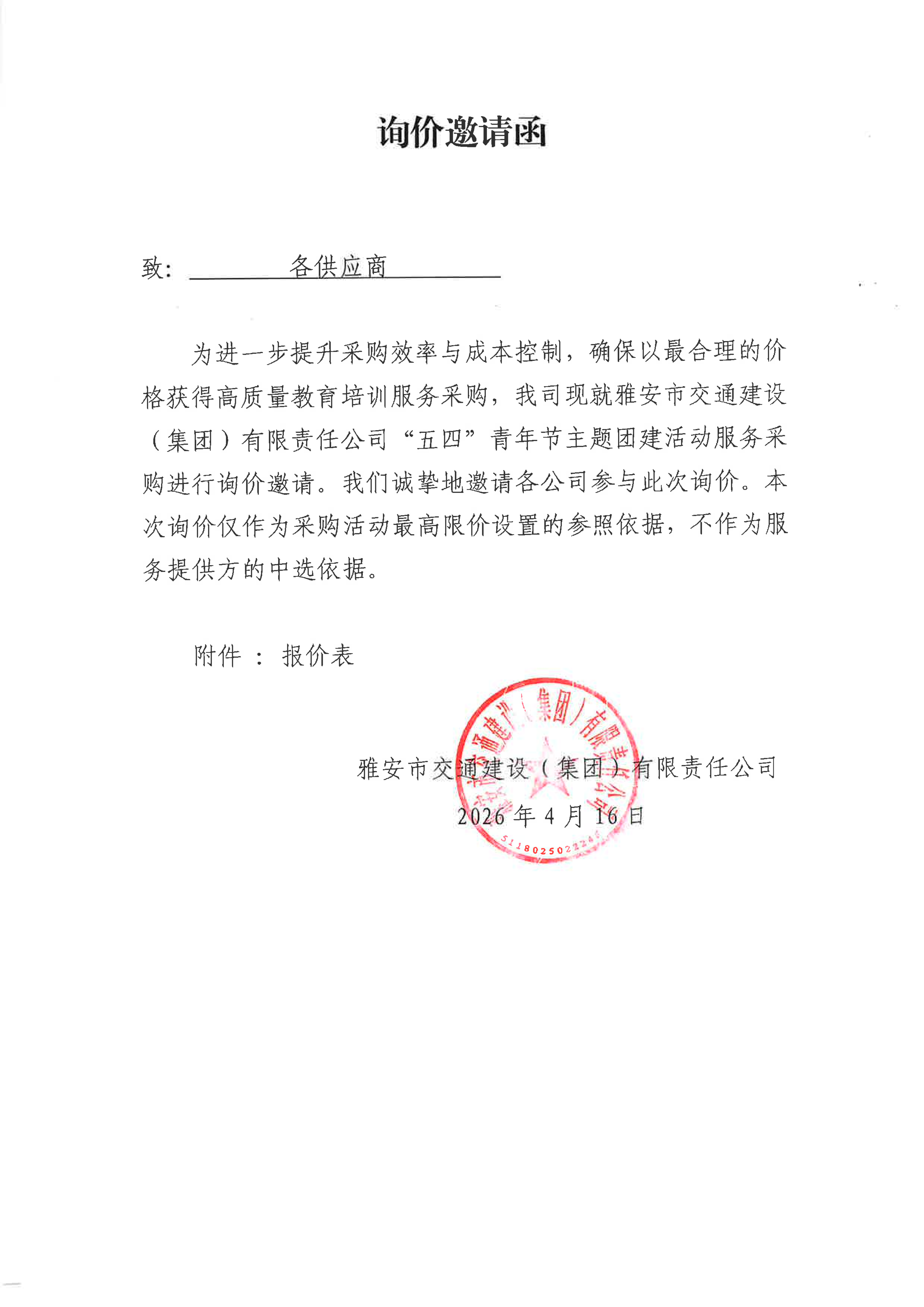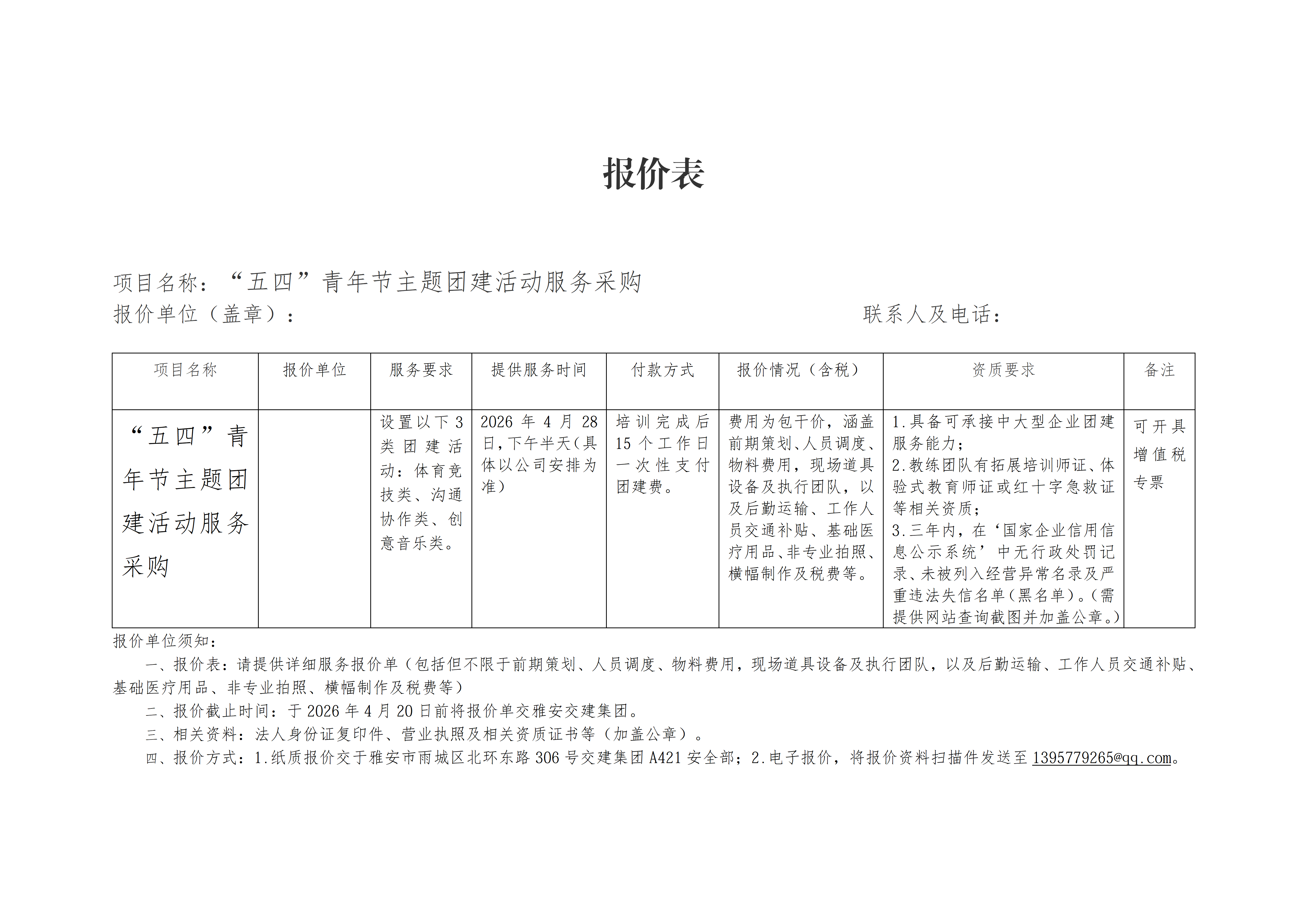 關(guān)于“五四”青年節(jié)主題團(tuán)建活動(dòng)服務(wù)采購(gòu)限價(jià)的詢價(jià)函
