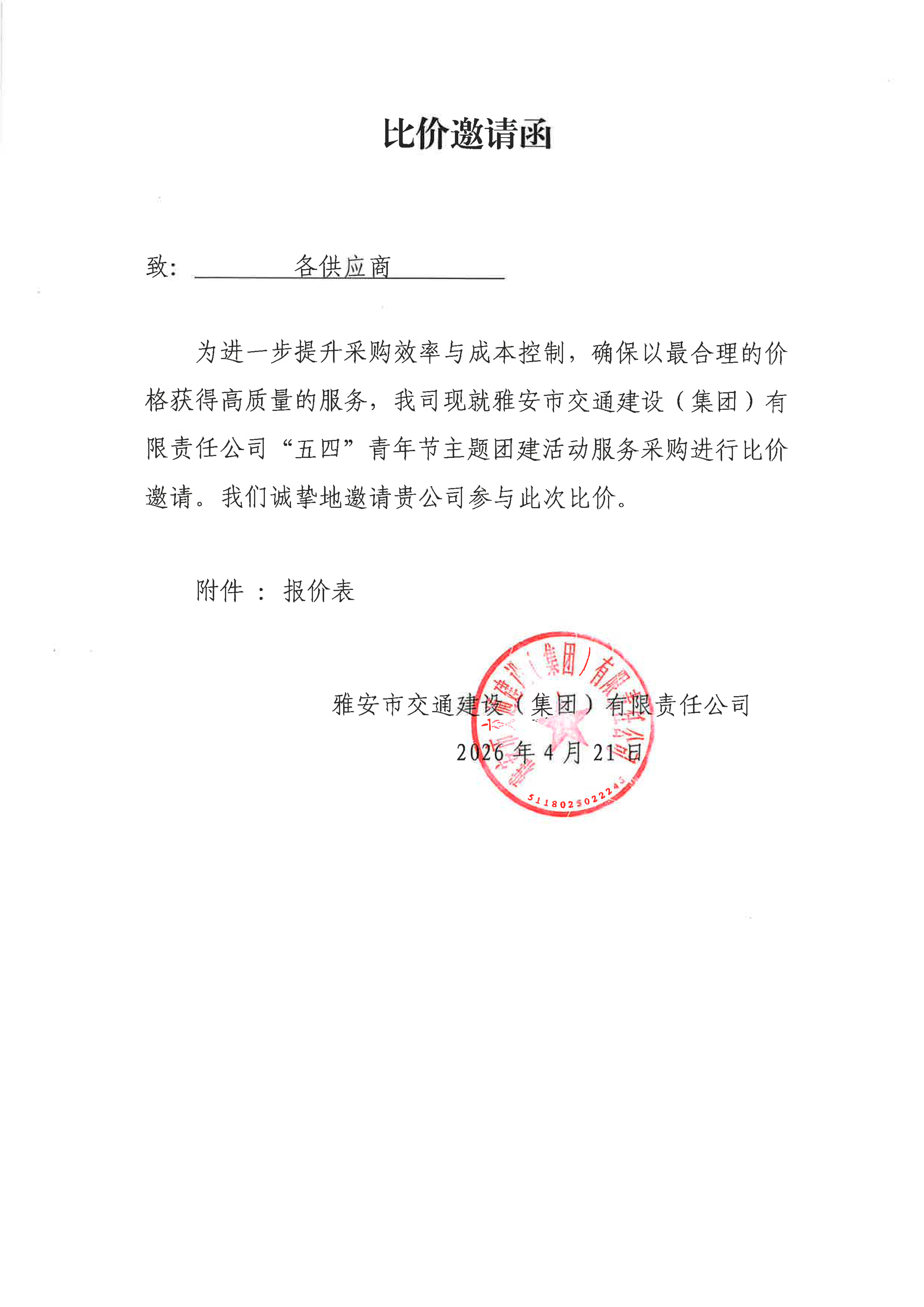關(guān)于“五四”青年節(jié)主題團建活動服務采購的比價邀請函