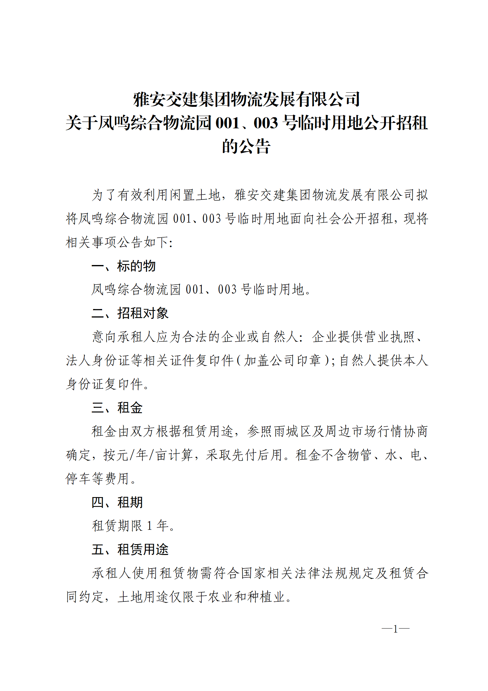 雅安交建集團物流發(fā)展有限公司 關(guān)于鳳鳴綜合物流園001、003號臨時用地公開招租的公告