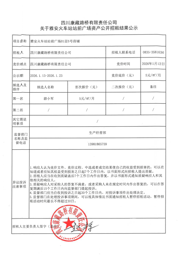 四川康藏路橋有限責(zé)任公司關(guān)于雅安火車(chē)站站前廣場(chǎng)資產(chǎn)公開(kāi)招租結(jié)果公示