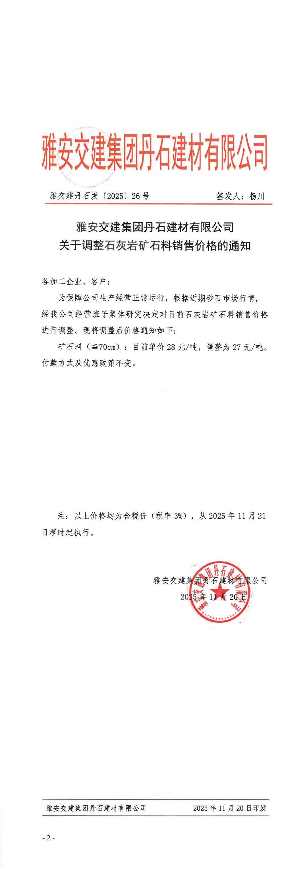 雅安交建集團(tuán)云石建材有限公司關(guān)于調(diào)整石灰?guī)r礦石料銷售價(jià)格的通知(2025.11.20)