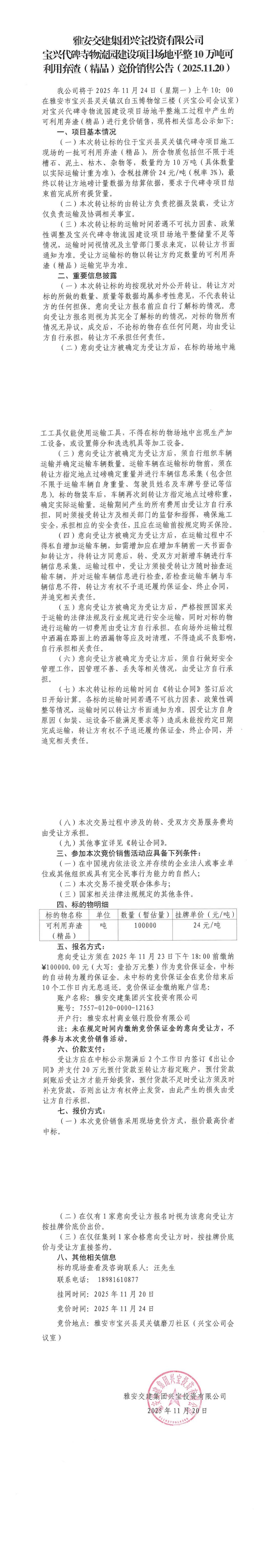 雅安交建集團興寶投資有限公司寶興代碑寺物流園建設項目場地平整10萬噸可利用棄渣(精品)競價銷售公告(2025.11.20)
